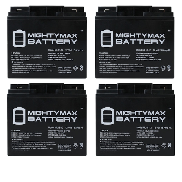 Delivering power when you need it, the Mighty Max ML18-12 12 Volt 18 AH uses a state of the art, heavy-duty, calcium-alloy grid that provides exceptional performance and service life in both float and cyclic applications. The ML18-12 is an Absorbent Glass Mat (AGM) technology with a valve regulated design, that can be used in enclosed and indoor environments without leaking or maintenance, providing a superior performance for thousands of models. SLA / AGM spill proof battery has a characteristic of high discharge rate, wide operating temperatures, long service life and deep discharge recover. Rechargeable battery that can be mounted in any position, resists shocks and vibration. Long lasting high performance in high and low temperatures. Mighty Max SLA batteries are utilized in a wide variety of applications including; Consumer Electronics, Electric Vehicles, Engine Starters, Golf Carts, Hunting, Lawn and Garden Tools, Medical Mobility, Motorcycles, Power sports, Portable Tools, Solar, Toys and Hobby, Access Control Devices, Emergency Lighting, Security and more. F2 Terminal, Charger is not included. 4 Pack
