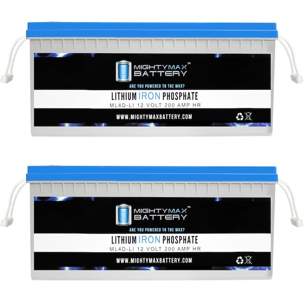 Invest in power with the Mighty Max 12V 200ah Lithium Iron Phosphate Battery. The ML4D-LI will take your deep cycle battery experience to a whole new horizon. Manufactured with the highest quality components and the customers safety in mind, this battery contains a battery management system BMS. BMS provides all kinds of protection for the battery and customer, equipped with Over charge and short circuit protection. Weighing only 48.00 lbs. and being a direct drop in replacement for its sister sealed lead acid and Gel batteries which weigh a hefty 114 lbs. Lighter, stronger and longer life span with 2500 cycles makes this the ideal battery for all your Deep Cycle applications such as, Solar / wind energy systems, Off Grid systems, RV, Camping, Backup power systems and much more. Attention - Designed to be used in parallel or in series with a maximum of 4 identical batteries. Make sure to only use a compatible lithium charger for this battery and tightly screw the terminals. Having loose terminals will cause a buildup of heat resulting in damage to the battery.