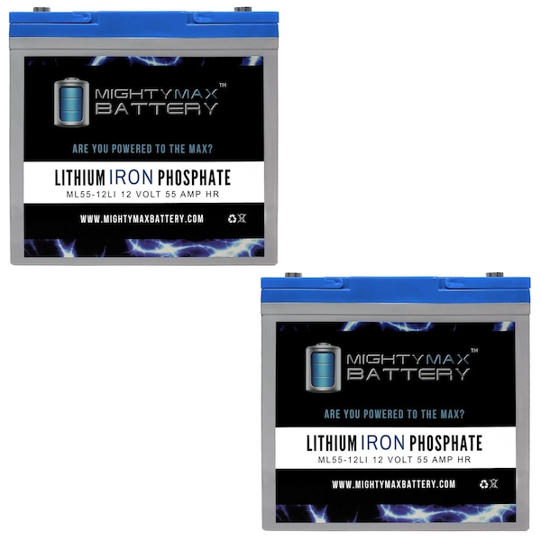 Invest in power with the Mighty Max 12V 55ah Lithium Iron Phosphate Battery. The ML55-12LI will take your deep cycle battery experience to a whole new horizon. Manufactured with the highest quality components and the customers safety in mind, this battery contains a battery management system BMS. BMS provides all kinds of protection for the battery and customer, equipped with Over charge and short circuit protection. Weighing only 19.00 lbs. and being a direct drop in replacement for its sister sealed lead acid and Gel batteries which weigh a hefty 40 lbs. Lighter, stronger and longer life span with 2500 cycles makes this the ideal battery for all your Deep Cycle applications such as, Solar / wind energy systems, Off Grid systems, RV, Camping, Backup power systems and much more. Attention - Designed to be used in parallel or in series with a maximum of 4 identical batteries. Make sure to only use a compatible lithium charger for this battery and tightly screw the terminals. Having loose terminals will cause a buildup of heat resulting in damage to the battery.