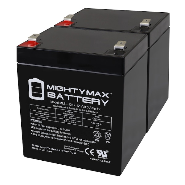 Delivering power when you need it, the Mighty Max ML5-12F2 12 Volt 5 AH uses a state of the art, heavy-duty, calcium-alloy grid that provides exceptional performance and service life in both float and cyclic applications. The ML5-12F2 is an Absorbent Glass Mat AGM technology with a valve regulated design, that can be used in enclosed and indoor environments without leaking or maintenance, providing a superior performance for thousands of models. Mighty Max SLA batteries are utilized in a wide variety of applications including; Consumer Electronics, Electric Vehicles, Engine Starters, Golf Carts, Hunting, Lawn and Garden Tools, Medical Mobility, Motorcycles, Power sports, Portable Tools, Solar, Toys and Hobby, Access Control Devices, Emergency Lighting, Security and more.