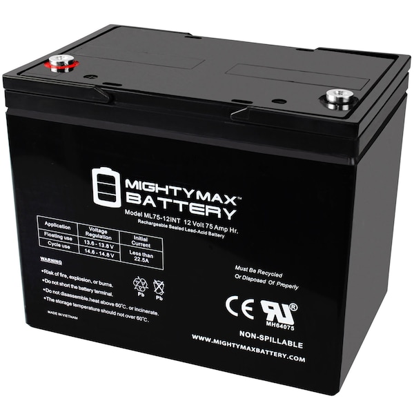 Delivering power when you need it, the Mighty Max ML75-12 Internal Thread 12 Volt 75 AH uses a state of the art, heavy-duty, calcium-alloy grid that provides exceptional performance and service life in both float and cyclic applications. The ML75-12 Internal Thread is an Absorbent Glass Mat AGM technology with a valve regulated design, that can be used in enclosed and indoor environments without leaking or maintenance, providing a superior performance for thousands of models. Mighty Max SLA batteries are utilized in a wide variety of applications including; Consumer Electronics, Electric Vehicles, Engine Starters, Golf Carts, Hunting, Lawn and Garden Tools, Medical Mobility, Motorcycles, Power sports, Portable Tools, Solar, Toys and Hobby, Access Control Devices, Emergency Lighting, Security and more.