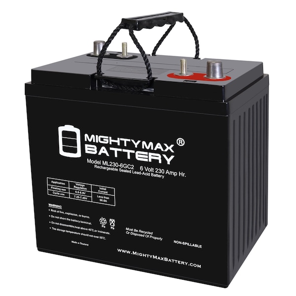 Delivering power when you need it, the Mighty Max ML230-6GC2 Dual Terminal 6 Volt 230 AH uses a state of the art, heavy-duty, calcium-alloy grid that provides exceptional performance and service life in both float and cyclic applications. The ML230-6GC2 Dual Terminal is an Absorbent Glass Mat AGM technology with a valve regulated design, that can be used in enclosed and indoor environments without leaking or maintenance, providing a superior performance for thousands of models. Mighty Max SLA batteries are utilized in a wide variety of applications including; Consumer Electronics, Electric Vehicles, Engine Starters, Golf Carts, Hunting, Lawn and Garden Tools, Medical Mobility, Motorcycles, Power sports, Portable Tools, Solar, Toys and Hobby, Access Control Devices, Emergency Lighting, Security and more.