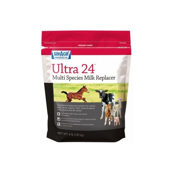 Ultra 24 Multi Species Milk Replacer is complete and balanced nutrition for calves, kids, lambs, piglets, foals, llama alpaca crias, fawn and elk calves High protein, high energy multispecies milk replacer 24 fat and 24 allmilk proteins to support optimal digestibility and performance Can be used as a dry supplement 8LB