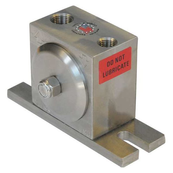 Pneumatic Vibrator, Housing Material Stainless Steel, Outlet Connection Size 3/8 in, Outlet Connection Type NPT, Air Flow Rate 7.5 cfm @ 60 psi, Maximum Force 270 lbf, Inlet Connection Size 1/4 in, Inlet Connection Type NPT, Maximum Vibration Speed 7,200 vpm, Maximum Bin Weight Capacity 2,700 lb, Overall Height 3.19 in, Overall Length 5.13 in, Overall Width 3.38 in, Sound Level 71 dBA, Duty Cycle Continuous, Pneumatic Vibrator Type Turbine, Force @ PSI 160 lbf @ 60 psi, 270 lbf @ 80 psi
