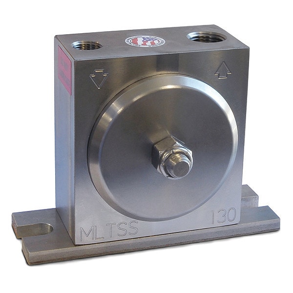 Pneumatic Vibrator, Housing Material Stainless Steel, Outlet Connection Size 1/4 in, Outlet Connection Type NPT, Air Flow Rate 4.5 cfm @ 60 psi, Maximum Force 75 lbf, Inlet Connection Size 1/8 in, Inlet Connection Type NPT, Maximum Vibration Speed 10,500 vpm, Maximum Bin Weight Capacity 750 lb, Overall Height 2.56 in, Overall Length 3.5 in, Overall Width 1.88 in, Sound Level 68 dBA, Duty Cycle Continuous, Pneumatic Vibrator Type Turbine, Force @ PSI 50 lbf @ 60 psi, 75 lbf @ 80 psi