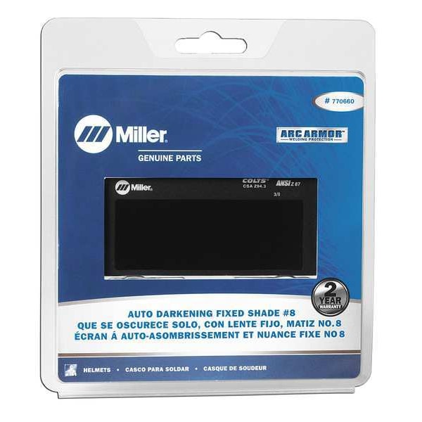 Welding Lens, Compatible with Brand Miller Electric, Compatible with Series Universal Fit, Features 2 Arc Sensors, Auto-On Or Auto-Off Circuitry, Solar Powered, For Use With Helmet That Accepts 2 in X 4 in Lenses, Lens Color Gray, Magnification No, Plate Length 4 in, Plate Thickness 0.056 in, Plate Width 3/16 in, Standards ANSI 87, CSA Z94.3, Welding Shade Designation W8