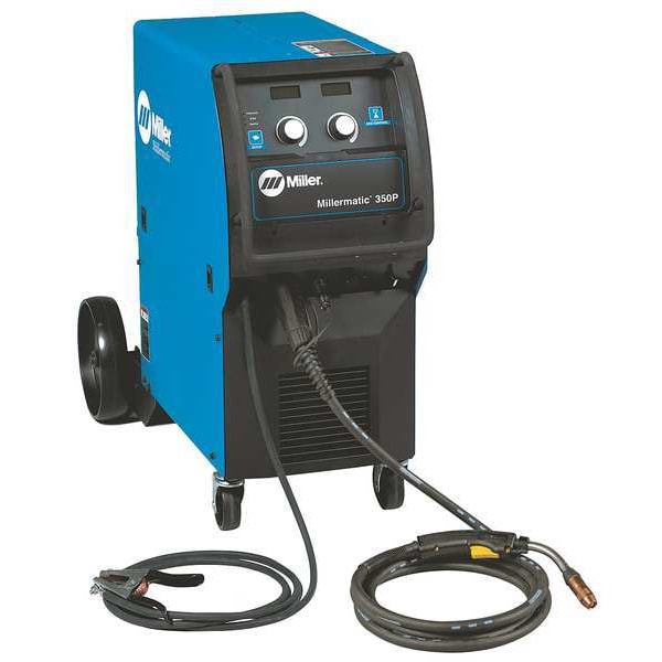 MIG Welder, Series Millermatic 350P, Input Voltage 208V AC, 220/230/240V AC, 460/480V AC, Phase Single-/Three-Phase, Welding Mode CV, Polarity DC, Input Frequency 60 Hz, Welding Processes Flux-Cored Welding (FCAW), MIG Welding (GMAW), For Wire Type Flux-Cored, Solid, Maximum Wire Diameter 0.045 in (Solid), 0.052 in (Flux-Cored), Maximum Wire Feed Speed 700 in/min, Model 907300, MIG Welding Output @ Duty Cycle 300 A @ 32 V DC, 60 Percent