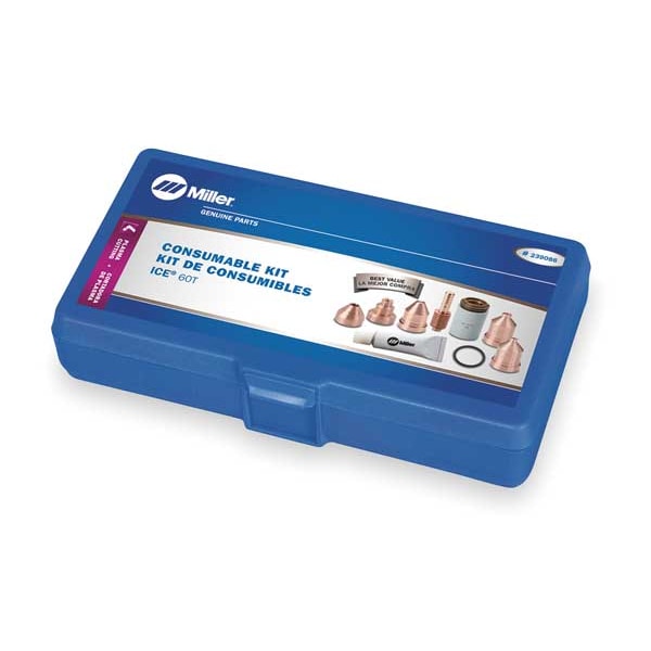 Plasma Torch Consumable Kit, Maximum Current 60 A, For Plasma Cutter Model 907390011, 907390012, For Plasma Cutter Series Spectrum 875, For Plasma Torch Model 234132, 234134, 234136, 234138, 300759, 300760, For Plasma Torch Series ICE-60T, For Plasma Torch Type Handheld, Includes (1) Drag Shield, (1) Gouge Shield, (1) Gouge Tip, (1) Retaining Cup, (1) Silicone Grease, (2) Extended Tips, (3) Electrodes, (3) O-Rings, (3) Tips, Welding Processes Plasma Cutting, Compatible with Brand Miller