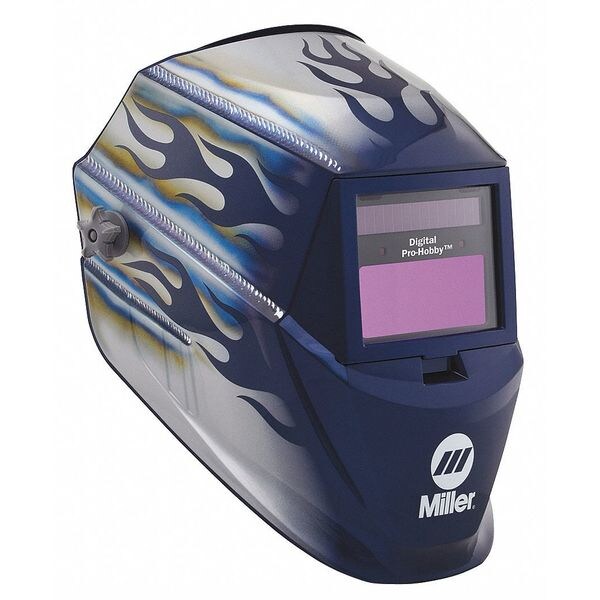 Welding Helmet, Color Flames/Silver, Features Two Arc Sensors - 1/20, 000 Sec Lens Speed, Sensitivity and Delay Control 0.10 to 1.0 Sec, TIG Rating 20 Amps, Auto-On/Auto-Off Power Control, Two Modes (Weld and Grind), Premium Headgear, Includes Lithium Batteries, Magnifying Lens Holder, 5 Outside and 2 Inside Cover Lenses, Series Digital Pro-Hobby, Viewing Area 6 1/16 sq in