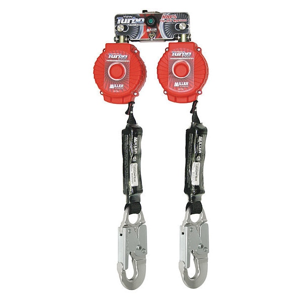 New patent-pending Twin Turbo D-Ring Connector easily adapts two (2) lightweight Miller TurboLite Personal Fall Limiters (PFLs) for continuous 100% tie-off fall protection.