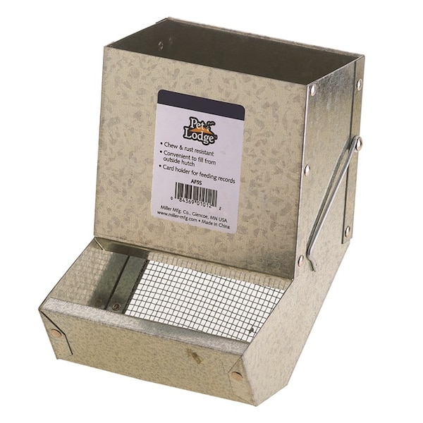 Rabbits and other small animals will not eat the fines (powdery residue) that collect in pelleted or grain feeds. If left in the feeder, these can attract harmful molds. This rabbit and small animal feeder has a wire mesh bottom that sifts fines out so they fall into the litter below. Includes independent wire hooks so the feeder can be attached to the inside of the hutch, or for more convenient filling to the outside with some wire cutting.Gravity design allows feeder to dispense several days worth of feed a little at a time. Features hinged metal lid for covering the feed. Made of chew-proof, rust-resistant, heavy-gauge galvanized steel. L 5.5” x W 3.125” x H 7.125” L 5.5” x W 5.125” x H 7.125” L 5.5” x W 7.125” x H 7.125”