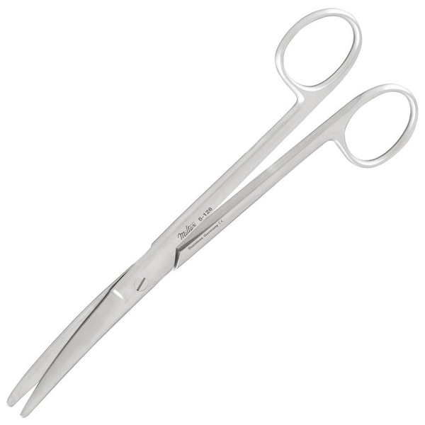 The Miltex 5126 Mayo scissors are made of German grade stainless steel They have a length of 675in, a curved bevel, and 2 blunt tips