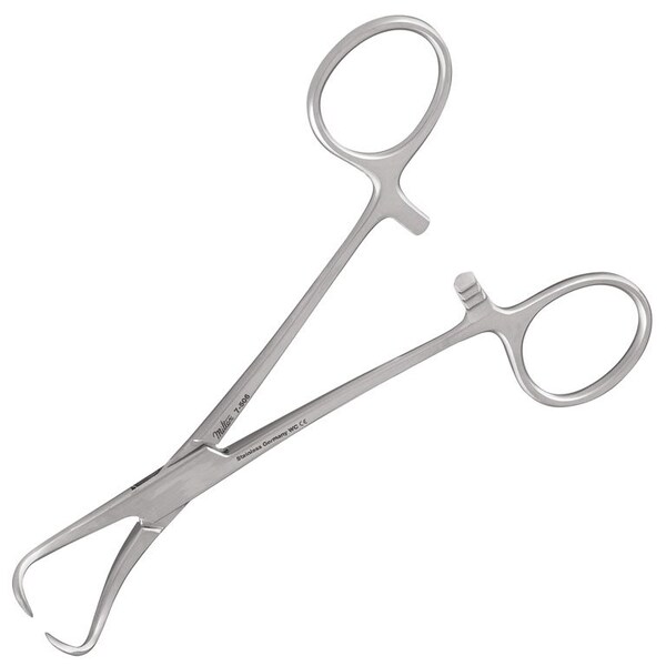 The Miltex 7506 Backhaus towel clamp is made of OR grade German stainless steel and measures 525 in length It has a finger ring handle with a ratchet lock