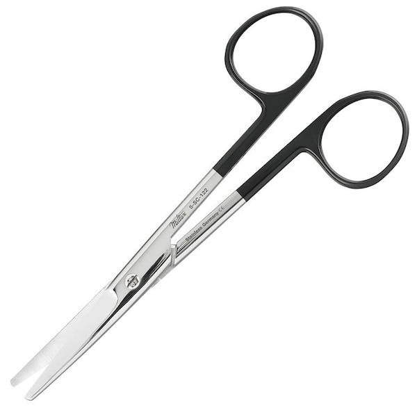 The Miltex 5SC122 SuperCut Mayo Scissors are made of German grade stainless steel These 55in operating scissors have a black handle, curved blades, and 2 blunt tips