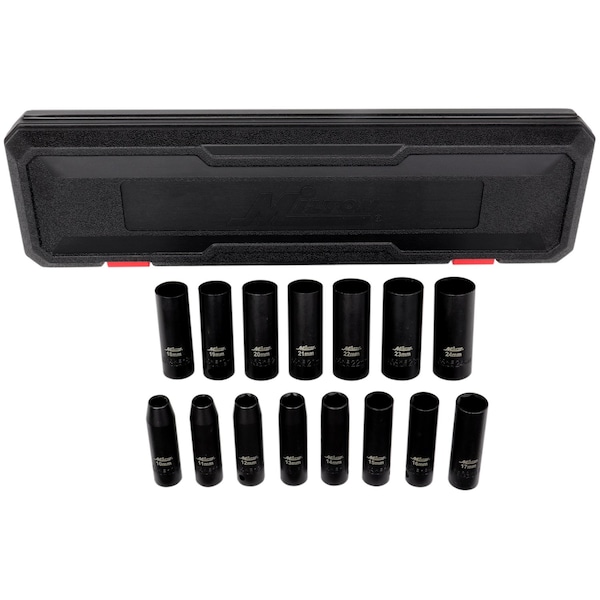 1/2 in. Drive Deep 6-Point Impact Socket Set, 10-24mm Metric, Steel Coated Black Oxide Finish 15-Piece. Milton impact socket sets are forged from the finest chrome-moly steel which provides the best strength and durability. Sockets are designed and crafted to take on the toughest jobs with solid performance. All sockets are marked with part number and size for ease of use.