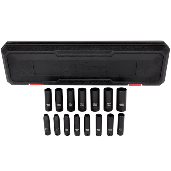 3/8 in. Drive Deep 6-Point Impact Socket Set, 6-20mm, Steel Coated Black Oxide Finish 15-Piece. Milton impact socket sets are forged from the finest chrome-moly steel which provides the best strength and durability. Sockets are designed and crafted to take on the toughest jobs with solid performance. All sockets are marked with part number and size for ease of use.