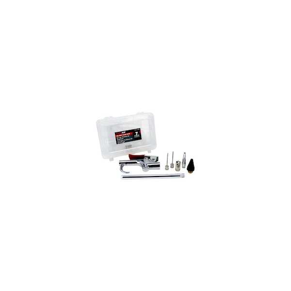 EXELAIR, 7 Piece, Blow Gun Kit, Great Starter Air Accessory Kit, Use For Any Air Compressor, Plated Steel, Brass & Aluminum Rust Resistant, Designed To Fit All 1/4 In Fitting, 150 PSI Maximum Pressure, Designed For Any Home Garage Or Automotive Shop, Durable For Any Heavy Duty Application, Storage Case Provides A Quick & Easy Way To Organization & Portability, Includes: Blow Gun, 6in Extension, Rubber Tip, Tapered Tip, Safety Adapter Nozzle, 2 Inflation Needles & Plastic Storage Case.