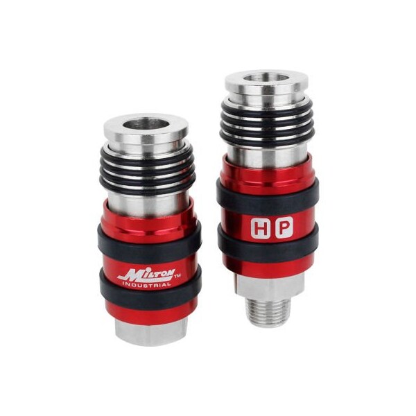 Milton's 2 in one universal safety exhaust couplers safely bleed excess air pressure, acting as a quick connect point to easily alter hose connections. This industrial 3/8" npt hose thread adapter can be used to safely disconnect hose fittings, providing a solid seal that won't damage the tubing of your air tool hoses before disconnecting. Milton's two-in-one design allows for an air compressor fitting that's compatible withtwo interchanges: h-style and p-style. As a hose thread adapter, this tool bleeds excess air, eliminating the threat of potentially dangerous hose whip. Instead, the air hose coupler remains connected to the plug while pressurized air is safely bled off. This sturdy barb hose fitting is made of heavy-duty steel, making it the ideal air compressor accessory for any air hose that requires a long-lasting pneumatic coupler.