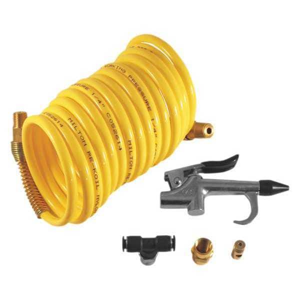 (1) 12 ft. Nylon ReKoil Hose, 1/4" Male National Pipe Thread Push to Connect Tee, #148 Blo Gun, #643 Brass Union, #1667 ReKoil Hose and #2204-2 Push to Connect Tee Fitting