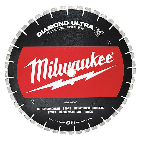 Diamond Saw Blade, Blade Dia. 14 in, Arbor Size 1 in, Arbor Shape Round, For Use With Saw Type Cut-off Saw, Handheld Gas Cut-off Saws, Low HP Walk Behind Saws, Masonry Saws, Cutting Type Wet/Dry, Rim Type Segmented, Primary Material Application General Purpose Concrete, Materials Cut Concrete, For Use On Concrete Type Green Concrete, Reinforced Concrete, Grade Best, Blade Thickness 0.125 in, Blade Material Diamond