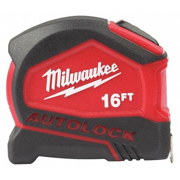 16ft Compact Auto-Lock Tape Measure has up to 12' of reach. The auto-lock design automatically locks your blade in place for quick and efficient measuring. Equipped with wear resistant nylon blade protection and an impact-resistant 5-point reinforced frame, these tapes withstand the jobsite.