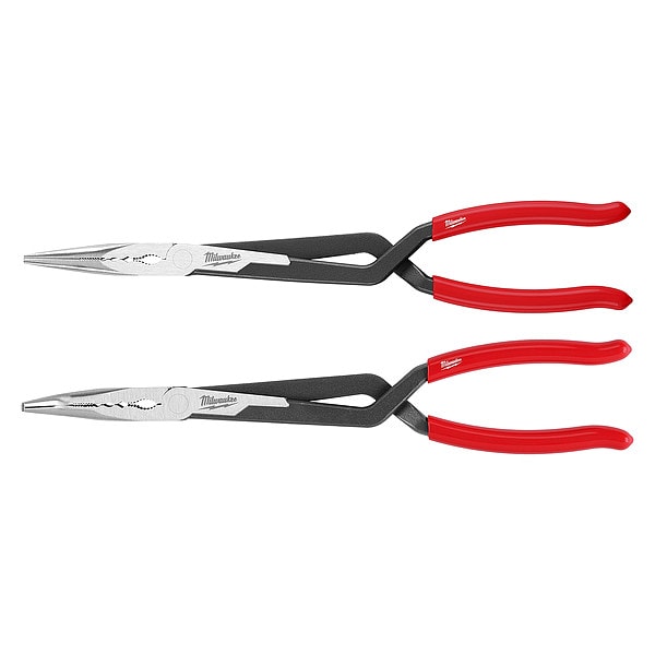 Long Reach Pliers Set, Plier Types Needle Nose Pliers, Nose Shape Needle, Jaw Bend 45 Degrees , ESD-Safe No, Overall Length 15 1/8 in, Maximum Jaw Opening 3 in, Jaw Length 3 in, 3 1/4 in, Tip Width 3/16 in, Number of Pliers 2, Precision No, Tether Ready No, Jaw Thickness Not Available, Insulated No, Jaw Shape Flat, Jaw Texture Serrated, Non-Sparking No, Voltage Rating Not Rated, Features Corrosion Resistant, Deep-Reach Cross Handle, Ergonomic Handle Design, Slip Resistant Grips