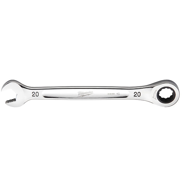 Ratcheting Combination Wrench, Chrome Vanadium Steel, Chrome, Head Size 20 mm, Overall Length 10 5/8 in, Head Offset Angle 0 Degrees , Opening Angle (Deg.) 0 Degrees , Standard, Head Thickness 20 mm, Metric, Rounded