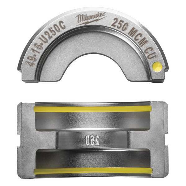 Upper and Lower Crimping Die, Compatible Connector Type U Style Dies, Compatible Cable Type Electrical Wire and Cable Crimping, Number of Crimping Sizes 2, Connector Color Code Yellow, Number of Pieces 1, Maximum Crimping Force 6 ton, Compatible with Brand M18(TM) FORCE LOGIC(TM), Compatible with Manufacturer Model Number 2679-20, 49-16-U000, Compatible with Series U Style, Application Electrical Wire and Cable Crimping, Crimping Capacity 250 kcmil