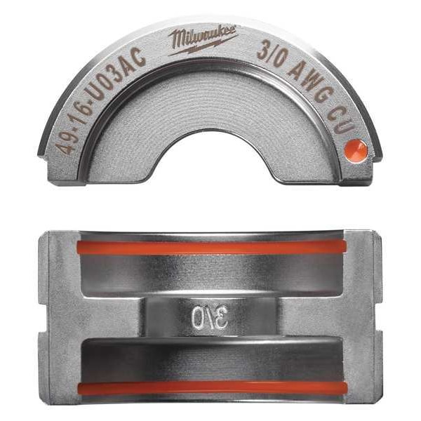 Upper and Lower Crimping Die, Compatible Connector Type U Style Dies, Compatible Cable Type Electrical Wire and Cable Crimping, Number of Crimping Sizes 2, Connector Color Code Orange, Number of Pieces 1, Maximum Crimping Force 6 ton, Compatible with Brand M18(TM) FORCE LOGIC(TM), Compatible Manufacturer Part Number 2679-20, 49-16-U000, Compatible with Series U Style, Application Electrical Wire and Cable Crimping, Crimping Capacity 3/0 AWG, Includes 3/0 Copper U Style Die (49-16-U03AC)