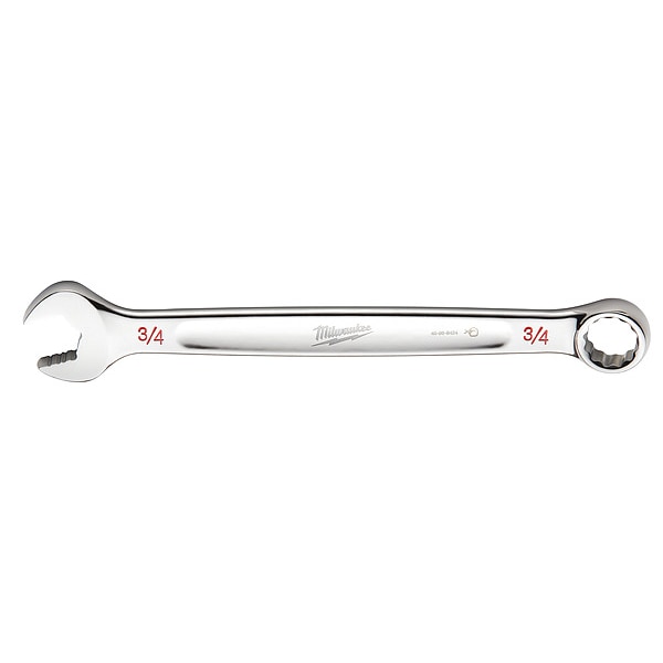 Combination Wrench, Chrome Vanadium Steel, Chrome, Head Size 3/4 in, Overall Length 9 3/4 in, Head Offset Angle 15 Degrees , Opening Angle (Deg.) 15 Degrees , Standard, Head Thickness 3/4 in, SAE, Rounded