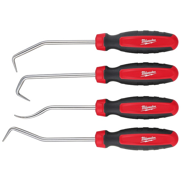 Hose Pick Set, Handle Material Plastic, Handle Style Screwdriver, Number of Pieces 4, Overall Length 11 1/2 in, Tip Material Chrome Vanadium Steel, Tip Style 45 Degrees Angle, Multi-Angle, Offset, Product Type Hook/Pick Set, Features Storage Tray, Finish Chrome Plated