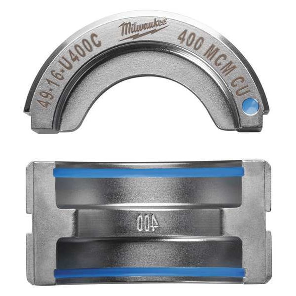 Upper and Lower Crimping Die, Compatible Connector Type U Style Dies, Compatible Cable Type Electrical Wire and Cable Crimping, Number of Crimping Sizes 2, Connector Color Code Blue, Number of Pieces 1, Maximum Crimping Force 6 ton, Compatible with Brand M18(TM) FORCE LOGIC(TM), Compatible Manufacturer Part Number 2679-20, 49-16-U000, Compatible with Series U Style, Application Electrical Wire and Cable Crimping, Crimping Capacity 400 kcmil, Includes 400 MCM Copper U Style Die (49-16-U400C)