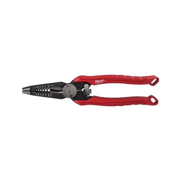 7-in-1 High-Leverage Combination Pliers feature seven core functions for electrical installation. The wide jaw pliers make grabbing and twisting wire easy, while the crimper provides you with added functionality when working with both insulated and non-insulated terminals. The wire cutter, wire stripper, and loop maker allow you to make quick wire preparation. The built-in reamer allows you to ream 1⁄2” through 1” conduit, while the bolt cutter cuts #6 and #8 bolts. A swing-lock design delivers fast, one-handed operation, and the high-leverage handles make cutting and crimping easier. The MILWAUKEE 7-in-1 electrical pliers provide maximum productivity and are perfect for the toughest jobsites.