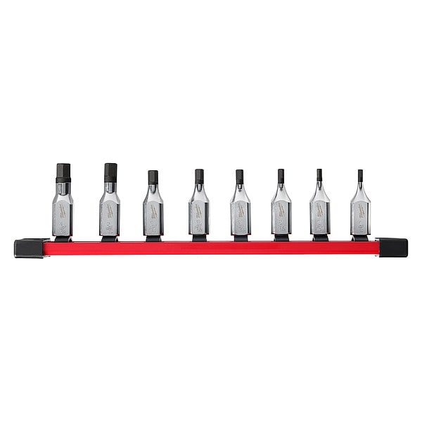 The MILWAUKEE 8PC 3/8" Drive SAE Hex Bit Socket Set with FOUR FLAT sides is designed from the ground up to be part of the most versatile socket family. Milwaukee bit sockets feature an innovative design with four parallel flat sides, which deter rolling and are wrench-compatible. This also creates a slim profile to provide the best access in tight spaces. The one-piece socket design offers improved durability compared to two-piece designs by eliminating the risk of the bit separating from the socket base. This set includes a storage rail for better organization. Laser engraved size markings provide easy identification and chrome plating offers rust and corrosion protection. All Milwaukee bit sockets are backed by a Lifetime Guarantee.