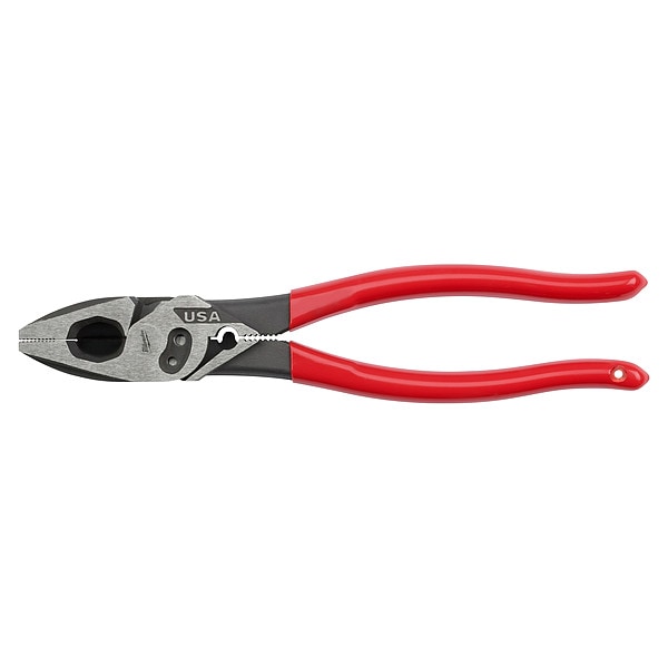 Dipped Grip Plier, Insulated No, Includes Voltage Detection Module No, Tether Ready Yes, Plier Type Lineman's Pliers, Overall Length 9 in, Jaw Shape Flat, Jaw Length 1 7/8 in, Jaw Width 1 1/4 in, Jaw Thickness 5/8 in, Handle Style Dipped Grip, Additional Tool Functions Bolt Cutter, Crimper, Fish Tape Puller, Non-Sparking No, ESD-Safe No, Voltage Rating Not Rated, High Leverage Yes, Blade Material Steel, Connectors Crimped Terminals, Cutter Length 3/4 in, Cutting Capacities Not Applicable