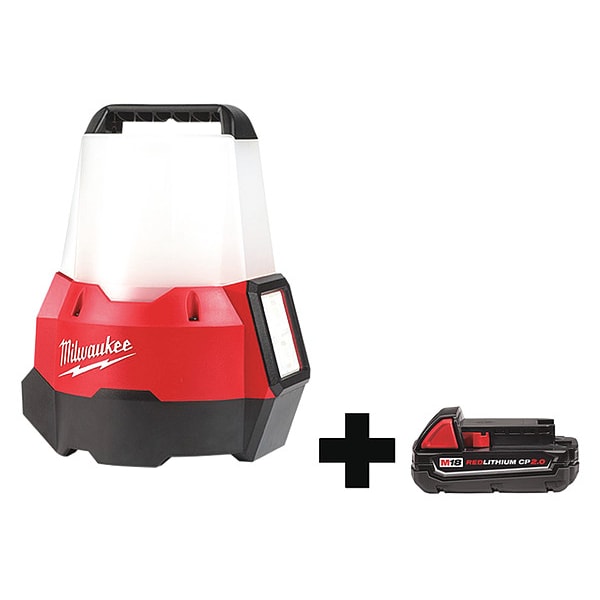 Site Light, Battery Platform M18(TM), Series RADIUS, Light Output Mode High, Low, Medium, Brightness Level 250 lm, 1,000 lm, 2,200 lm, Maximum Brightness Level 2,200 lm, Minimum Brightness Level 250 lm, Mount Type Floor Stand, Hook, Maximum Height 10 3/8 in, Minimum Height 10 3/8 in, Light Distribution 90 Degrees , 360 Degrees , Head Type Fixed, Maximum Head Rotation Angle 0 Degrees , Cordless Tool Kit Contents Bare Tool, Battery, Battery Capacity 5.0 Ah, Voltage 18V DC