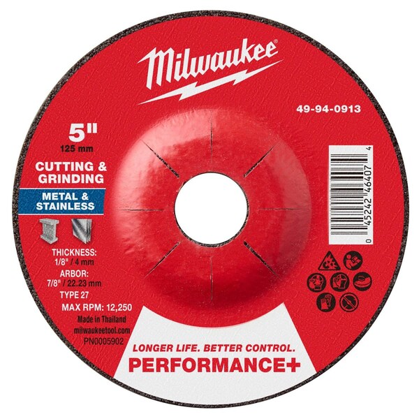 Cut-Off & Grinding Wheel, Abrasive Material Zirconia Alumina, Connector Size 7/8 in, Connector Type Unthreaded Hole, Grit 24, Overall Diameter 5 in, Overall Thickness 0.125 in, Primary Material Application Stainless Steel, Steel, Compatible Tool Type Angle Grinder, Series Not Applicable, Wheel Type Type 27, Maximum Operating Speed 12,250 RPM