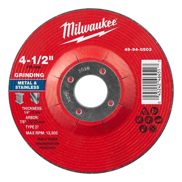 Grinding Wheel, Abrasive Material Aluminum Oxide, Connector Size 7/8 in, Connector Type Unthreaded Hole, Grit 30, Overall Diameter 4 1/2 in, Overall Thickness 0.25 in, Primary Material Application Stainless Steel, Steel, Compatible Tool Type Angle Grinder, Series Not Applicable, Wheel Type Type 27, Maximum Operating Speed 13,300 RPM