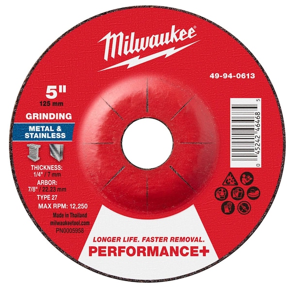 Grinding Wheel, Abrasive Material Zirconia Alumina, Connector Size 7/8 in, Connector Type Unthreaded Hole, Grit 24, Overall Diameter 5 in, Overall Thickness 0.25 in, Primary Material Application Stainless Steel, Steel, Compatible Tool Type Angle Grinder, Series Not Applicable, Wheel Type Type 27, Maximum Operating Speed 12,250 RPM