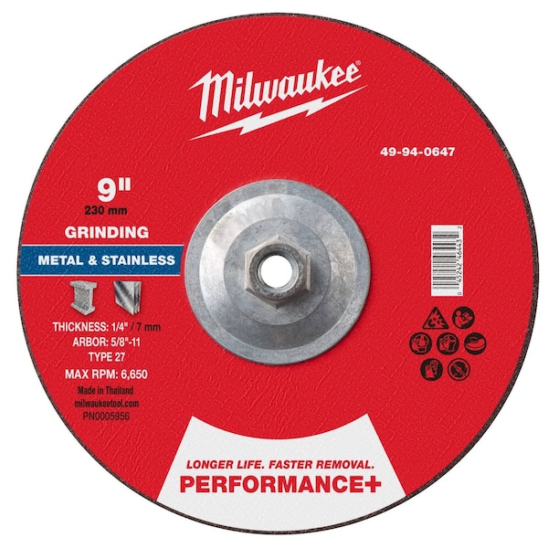 Grinding Wheel, Abrasive Material Zirconia Alumina, Connector Size 5/8 In.-11, Connector Type Threaded Hole, Grit 30, Overall Diameter 9 in, Overall Thickness 0.25 in, Primary Material Application Stainless Steel, Steel, Compatible Tool Type Angle Grinder, Series Not Applicable, Wheel Type Type 27, Maximum Operating Speed 6,650 RPM