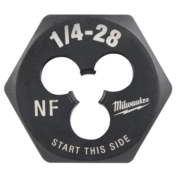 Hex Threading Die, Thread Size 1/4 In.-28, NF, Solid, Outside Dia. 1 1/8 in, Die Material High Carbon Steel, Finish - Machining Black Oxide, Thread Type NF, Thread Pitch Not Applicable, Threads per Inch 28, Thread Direction Right Hand, Die Thickness 1/2 in, Die Shape Hex, Hex Size 1 in