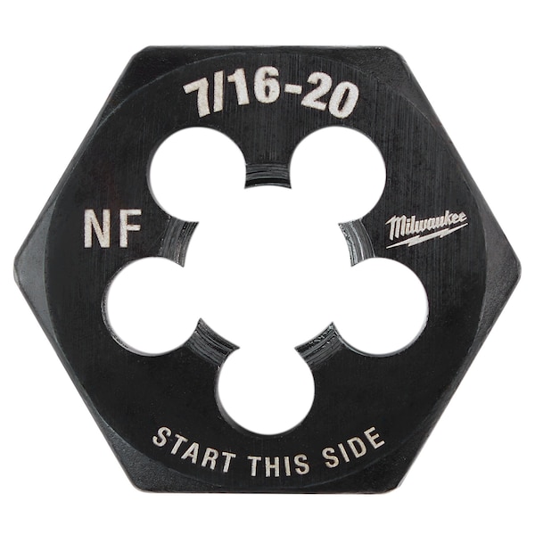 Hex Threading Die, Thread Size 7/16 In.-20, NF, Solid, Outside Dia. 1 1/8 in, Die Material High Carbon Steel, Finish - Machining Black Oxide, Thread Type NF, Thread Pitch Not Applicable, Threads per Inch 20, Thread Direction Right Hand, Die Thickness 1/2 in, Die Shape Hex, Hex Size 1 in