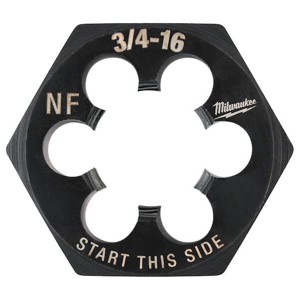 Hex Threading Die, Thread Size 3/4 In.-16, NF, Solid, Outside Dia. 1 7/16 in, Die Material High Carbon Steel, Finish - Machining Black Oxide, Thread Type NF, Thread Pitch Not Applicable, Threads per Inch 16, Thread Direction Right Hand, Die Thickness 1/2 in, Die Shape Hex, Hex Size 1-7/16 in