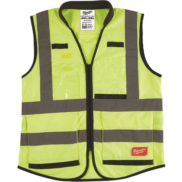The MILWAUKEE L/XL CSA Yellow ANSI Type R Class 2 High Visibility Safety Vest is designed to carry more. The high visibility safety vest has 10 pockets, including a clear ID holder and an internal pocket for additional storage. This yellow safety vest with pockets features a quick internal size adjustment, providing users with a better fit and a durable pass-through slit for fall protection gear. The size adjustment allows users to wear the Milwaukee safety vest in the summer over a t-shirt or in the winter over a jacket. The zipper closure on these high visibility safety vests delivers users ultimate jobsite security. Class 2 high visibility reflective safety vests are recommended when working in environments with traffic traveling under 50 mph or when working around heavy machinery. This includes construction, road construction, traffic direction, utility crews, and survey crews.Secure Zipper ClosureClear ID Holder and Velcro Opening and ClosureFall Protection Pass ThroughReinforced Pen Pockets with 600D Tear Resistant MaterialDurable Dual Mic Tabs1 Internal PocketHang Loop For Easy StorageThird-Party TestedANSI107-15 Type R Class 2Third-party tested