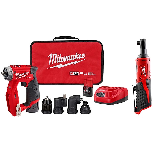 Cordless Combination Kit, Cordless Tools Included Installation Driver, Ratchet, Voltage 12 V DC, Power Source Cordless, Number of Tools 2, Battery Capacity 2.0Ah, Includes (2) Bare Tools, (2) Batteries, Charger, Tool Brand Milwaukee, Series M12(TM), Battery Included 38D763, Number of Batteries Included 2, Battery Model No. 38D763, Battery Series M12(TM) REDLITHIUM(TM), Charger 2XKZ7, Charger Included Yes, Cordless Tool Kit Contents (2) Bare Tools, (2) Batteries, (1) Charger