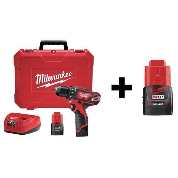 Cordless Drill/Driver Kit, Voltage 12V DC, Battery Included, Battery Capacity 1.5 Ah, Cordless Tool Battery Type Li-Ion, Brushless Motor No, Number of Batteries 3, M12 Series, No Load RPM 0 to 400/0 to 1500, Chuck Size 3/8 in, Max. Torque 275 in-lb, Battery Included (3) 38D763, Transmission 2-Speed, Clutch Style Adjustable, Battery Pack Replacement 38D763, Chuck Keyless, Tool Length 7-3/8 in, Tool Weight 2.5 lb