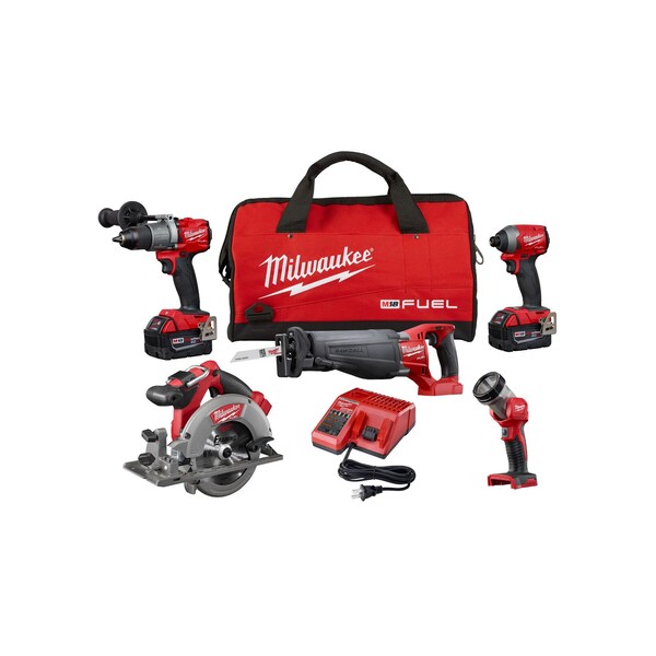 Cordless Combination Kit, Cordless Tools Included Circular Saw, Hammer Drill, Impact Driver, Reciprocating Saw, Work Light, Voltage 18 V DC, Power Source Cordless, Number of Tools 5, Battery Capacity (2) 5.0 Ah, Includes (1) Side Handle, (2) Belt Clip, (2) Bit Holder, Tool Brand Milwaukee, Series M18 FUEL(TM), Battery Included Yes, Number of Batteries Included 2, Battery Model No. (2) 35GJ99, Battery Series M18(TM) REDLITHIUM(TM), Charger 23Y581, Charger Included Yes