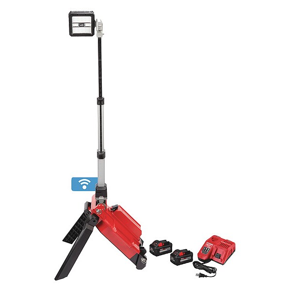 Cordless Tripod Light, Battery Platform M18, Series ROCKET, Light Output Mode High / Medium / Low, Brightness Level 1,600 lm, 3,100 lm, 5,400 lm, Maximum Brightness Level 5,400 lm, Minimum Brightness Level 1,600 lm, Mount Type Tripod, Maximum Height 60 1/2 in, Minimum Height 22 in, Light Distribution 90 Degrees , Head Type Rotating, Maximum Head Rotation Angle 220 Degrees , Cordless Tool Kit Contents Bare Tool, Charger, (2) Batteries, Battery Capacity 8.0 Ah, Run Time 7 hr, 12.5 hr, 26 hr