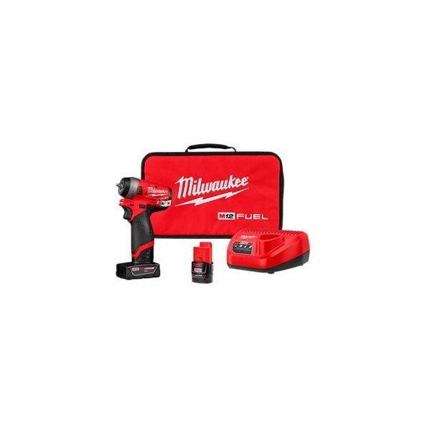 M12 FUEL 1/4" STUBBY IMPACT WRENCH KIT THE M12 FUELTM 1/4" STUBBY IMPACT WRENCH IS THE INDUSTRY'S MOST COMPACT CORDLESS IMPACT WRENCH. AT ONLY 5.1" IN LENGTH, IT ALLOWS YOU TO WORK IN TIGHTER SPACES DELIVERING THE POWER TO COMPLETE MANY OF THE MOST DEMANDING TASKS AND INCREASING YOUR PRODUCTIVITY. THE COMPACT IMPACT DELIVERS HIGH TORQUE WITH THE POWERSTATETM BRUSHLESS MOTOR. THE IMPACT WRENCH DELIVERS AN INDUSTRY LEADING 100 FT.-LBS. OF BREAKAWAY TORQUE. THIS ALLOWS YOU TO REMOVE EVEN THE MOST STUBBORN BOLTS AND FASTENERS. THIS CORDLESS IMPACT WRENCH FEATURES BUILT-IN REDLIINKTM TOOL TECHNOLOGY TO HELP YOU GET THE JOB DONE. 4-MODE DRIVE CONTROL PROVIDES YOU WITH UNMATCHED CONTROL IN VARIOUS FASTENING APPLICATIONS MODES 1-3 GIVES YOU PRECISION AND CONTROL FOR ANY APPLICATION. AN AUTO-SHUT-OFF MODE IN THE 4TH SETTING PREVENTS OVER-FASTENING OF BOLTS WHILE DOING REASSEMBLY WORK. THE MILWAUKEE® M12 FUEL 1⁄4" STUBBY IMPACT WRENCH IS PART OF THE M12TM BATTERY LINE, FEATURING OVER 90 POWERFUL AND COMPACT TOOLS. THE KIT INCLUDES ONE M12TM REDLIHTIUMTM CP2.0 BATTERY PACK, ONE 12TM REDLITHIUMTM XC4.0 EXTENDED CAPACITY BATTERY PACK, AND ONE M12TM LITHIUM-ION BATTERY CHARGER. INCLUDES: