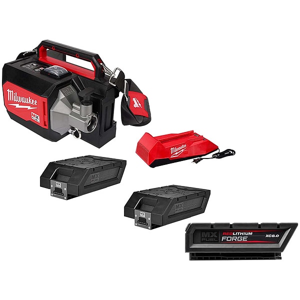 (1) MX FUEL(TM) CHARGER (MXFC), (1) MX FUEL(TM) Concrete Vibrator, (1) Remote for MX FUEL(TM) Concrete Vibrator (3701), (1) Shoulder Strap, (3) MX FUEL(TM) REDLITHIUM(TM)